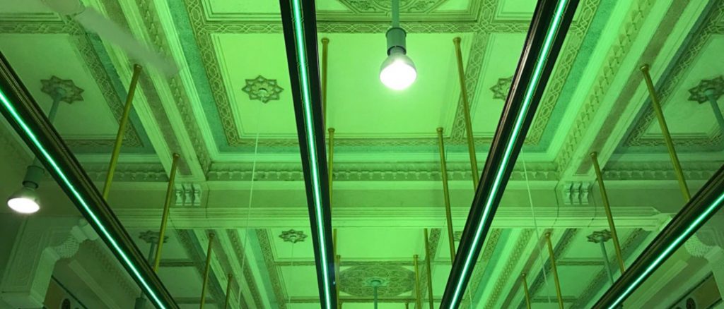 From Safa, make your way towards Marwa. Between Safa and Marwa, you will encounter two sets of green fluorescent lights approximately 50 metres apart, which indicate the distance that Hajar ran in order to get to higher ground. These two markers are known as Milayn al-Akhdharayn (the two green mileposts). Between these two lights, it is Sunnah for men to run at a medium pace while women should continue normally.